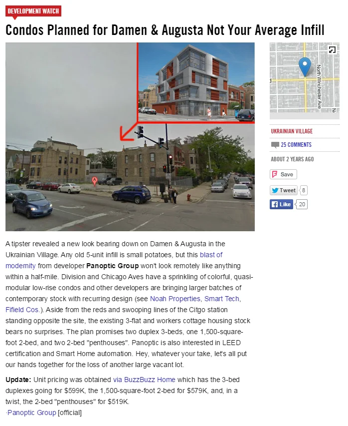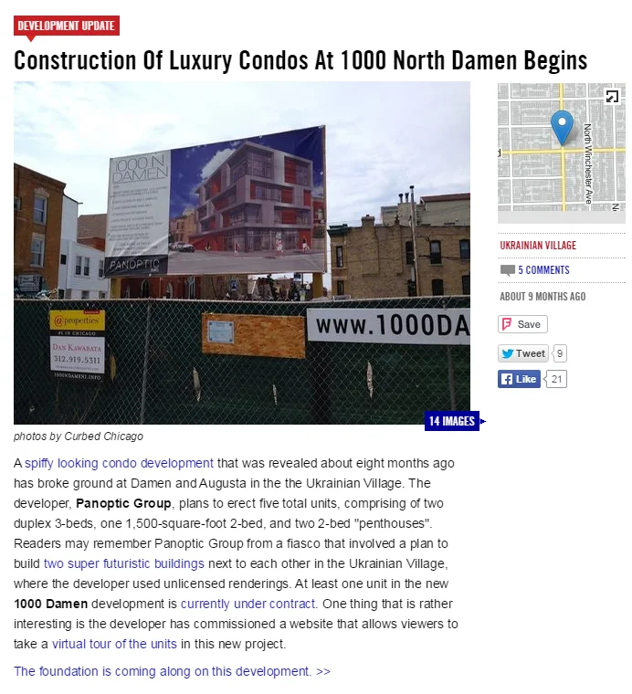 From the article: A spiffy looking condo development that was revealed about eight months ago has broke ground at Damen and Augusta in the the Ukrainian Village. The developer, Panoptic Group, plans to erect five total units, comprising of two duplex 3-beds, one 1,500-square-foot 2-bed, and two 2-bed "penthouses". Readers may remember Panoptic Group from a fiasco that involved a plan to build two super futuristic buildings next to each other in the Ukrainian Village, where the developer used unlicensed renderings. At least one unit in the new1000 Damen development is currently under contract. One thing that is rather interesting is the developer has commissioned a website that allows viewers to take a virtual tour of the units in this new project...
