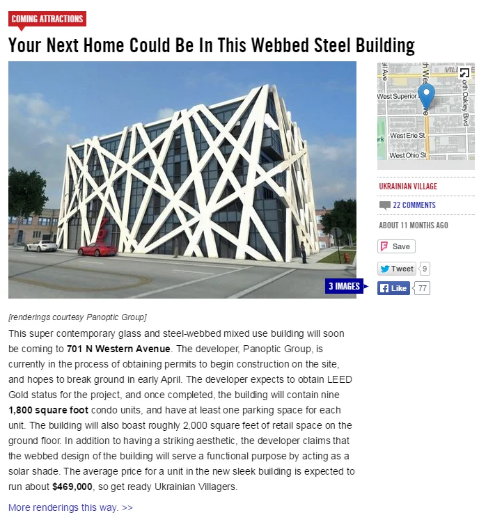 From the article: This super contemporary glass and steel-webbed mixed use building will soon be coming to 701 N Western Avenue. The developer, Panoptic Group, is currently in the process of obtaining permits to begin construction on the site, and hopes to break ground in early April. The developer expects to obtain LEED Gold status for the project, and once completed, the building will contain nine1,800 square foot condo units, and have at least one parking space for each unit. The building will also boast roughly 2,000 square feet of retail space on the ground floor. In addition to having a striking aesthetic, the developer claims that the webbed design of the building will serve a functional purpose by acting as a solar shade. The average price for a unit in the new sleek building is expected to run about $469,000, so get ready Ukrainian Villagers...