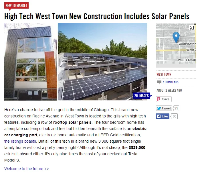 From the article: Here's a chance to live off the grid in the middle of Chicago. This brand new construction on Racine Avenue in West Town is loaded to the gills with high tech features, including a row of rooftop solar panels. The four bedroom home has a template contempo look and feel but hidden beneath the surface is an electric car charging port, electronic home automatic and a LEED Gold certification,the listings boasts. But all of this tech in a brand new 3,300 square foot single family home will cost a pretty penny right? Although it's not cheap, the $929,000ask isn't absurd either. It's only nine times the cost of your decked out Tesla Model S...