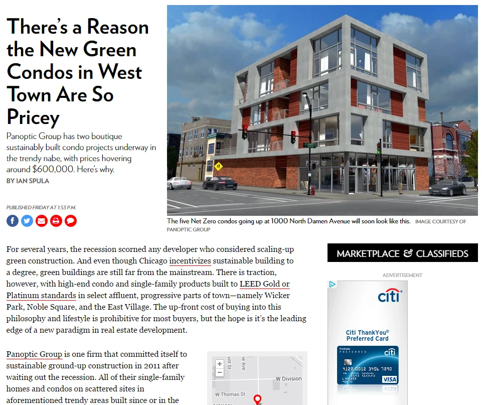 From the article: For several years, the recession scorned any developer who considered scaling-up green construction. And even though Chicago incentivizes sustainable building to a degree, green buildings are still far from the mainstream. There is traction, however, with high-end condo and single-family products built to LEED Gold or Platinum standards in select affluent, progressive parts of town—namely Wicker Park, Noble Square, and the East Village. The up-front cost of buying into this philosophy and lifestyle is prohibitive for most buyers, but the hope is it’s the leading edge of a new paradigm in real estate development.