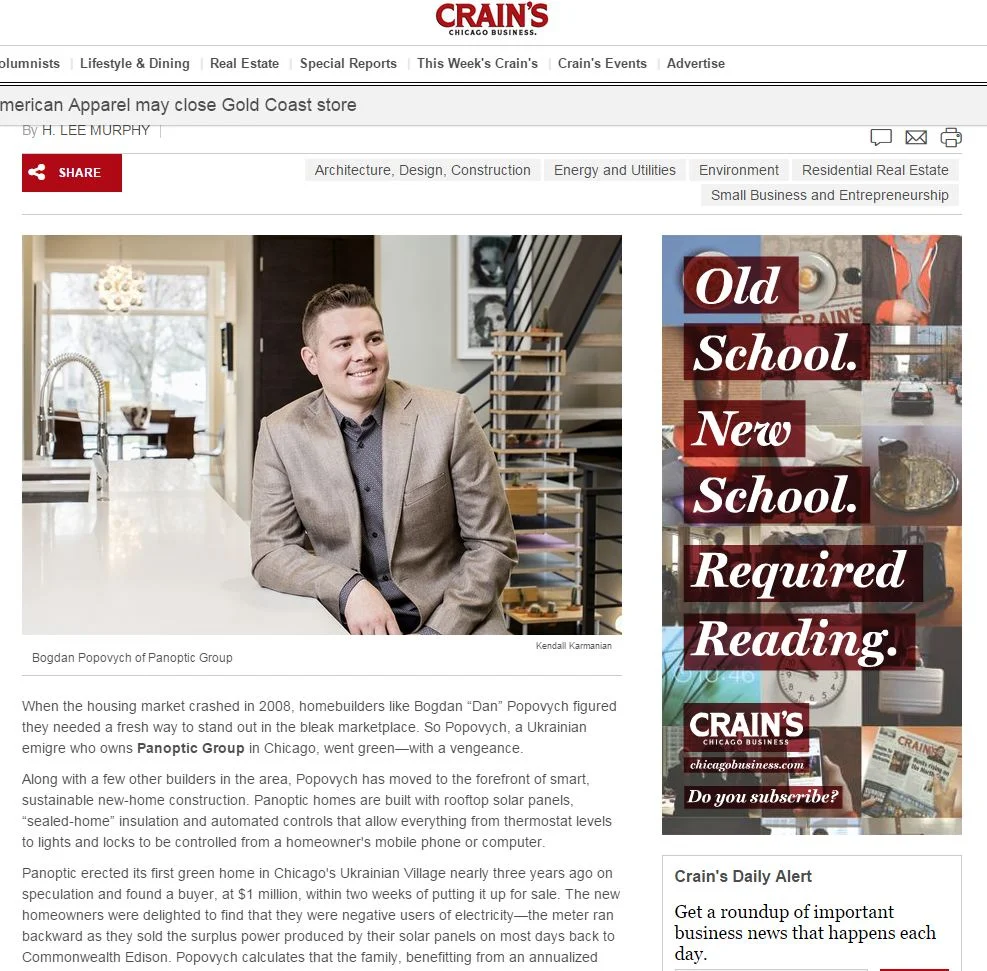 From the Article: When the housing market crashed in 2008, homebuilders like Bogdan “Dan” Popovych figured they needed a fresh way to stand out in the bleak marketplace. So Popovych, a Ukrainian emigre who owns Panoptic Group in Chicago, went green—with a vengeance.